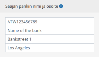 Lisäksi annetaan Saajan pankin nimi ja osoitetietoihin saajan pankin nimi.