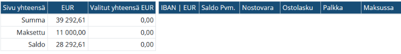 Tiedot näytetään vain Maksussa-tilassa olevilta kaikilta ostolaskuilta IBAN-kohtaisesti. Maksussa-sarakkeessa näkyvät summat niin pitkään kun ostolasku on maksussa tilassa ja sille on luotu maksuaineisto, jota ei ole tiliotteelta vahvistettu maksetuksi.