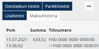 Huom. Pankkiyhteyden ollessa käytössä ostolaskun tila muuttuu Maksussa-tilaan vasta kun lähetys pankkiin on onnistunut. Ilman pankkiyhteyttä ostolasku muuttuu Maksussa-tilaan kun aineisto luodaan. Luodut aineistot näkyvät ostolaskulla Maksuhistoria-välilehdellä.
