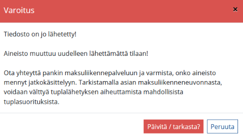 Mikäli pankin vastausta lähetykselle ei saada, ohjelma antaa käyttäjälle seuraavan ilmoituksen: "Ota yhteyttä pankin maksuliikennepalveluun ja varmista, onko aineisto tästä huolimatta mennyt jatkokäsittelyyn. Tarkistamalla asian maksuliikenneneuvonnasta, voidaan välttyä tuplalähetyksen aiheuttamista mahdollisista tuplasuorituksista".