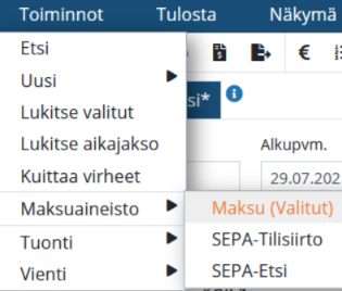 Valitaan laskulistalta suoritettavat laskut aktiiviseksi ja valitaan Toiminnot-valikko > Maksuaineisto > SEPA - Maksu (valitut)