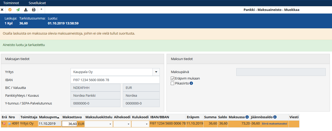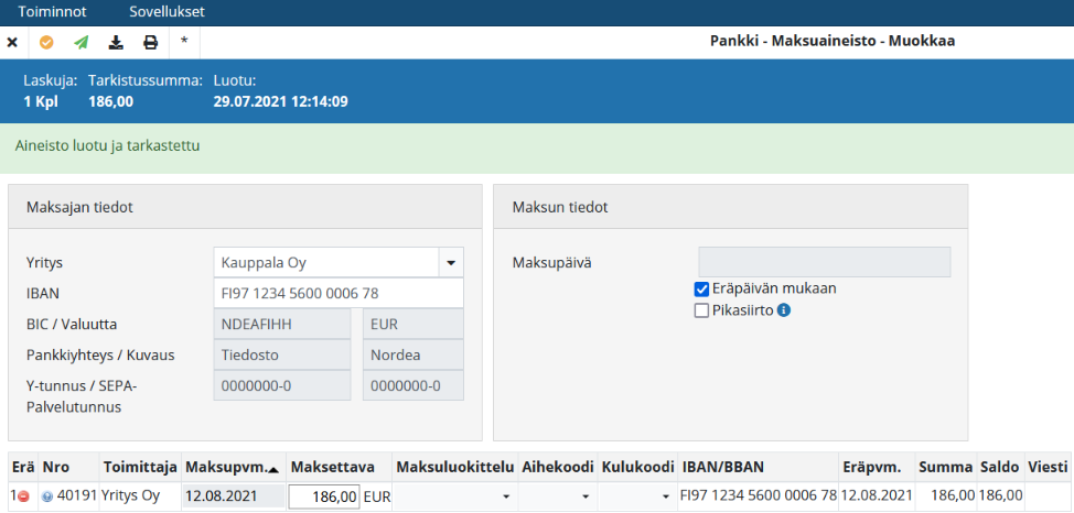 Maksuaineiston luonti näkymässä voidaan vielä muuttaa maksuaineistoa: