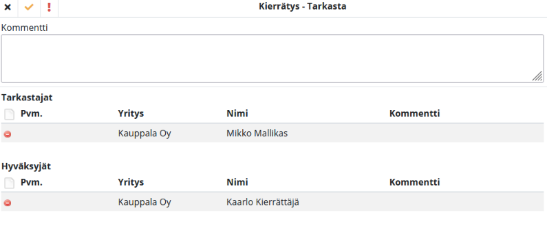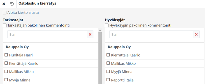 Mikäli kustannuspaikan tai toimittajan taakse on määritelty oletustarkastajia ja -hyväksyjiä, ovat he valittuna valmiiksi tässä ikkunassa. Tarkastajien ja hyväksyjien hakemista asiakkaan tai kustannuspaikan takaa voidaan säätää kierron asetuksissa.