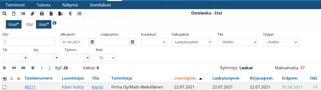 Kaikkien pakollisten tietojen tulee olla syötettynä ennen kuin ostolasku voidaan siirtää kiertoon.