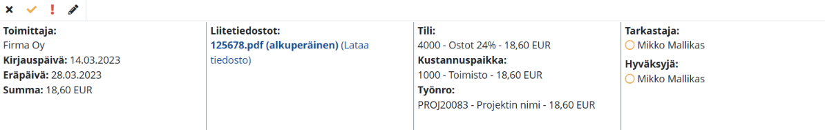 Ylhäällä on laskun perustietoja, tiliöintitiedot ja tarkastaja- ja hyväksyjätiedot.