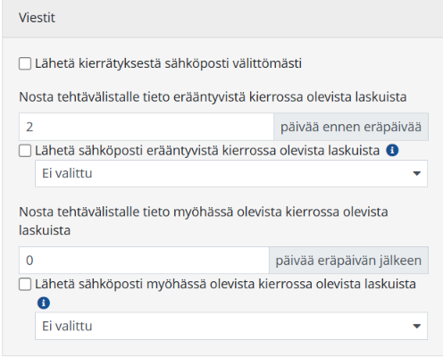 Ostolaskun asetuksissa Kierto-välilehdellä voidaan määritellä lähetetäänkö kierrossa olevista erääntyvistä ja kierrossa olevista myöhässä olevista laskuista sähköpostia tarkastajille ja hyväksyjille, sekä nostetaanko kierrossa olevat erääntyvät ja myöhässä olevat laskut milloin tehtävälistalle. Lisäksi voidaan määritellä lähetetäänkö sähköposti tarkastajille vai hyväksyjille vai molemmille.