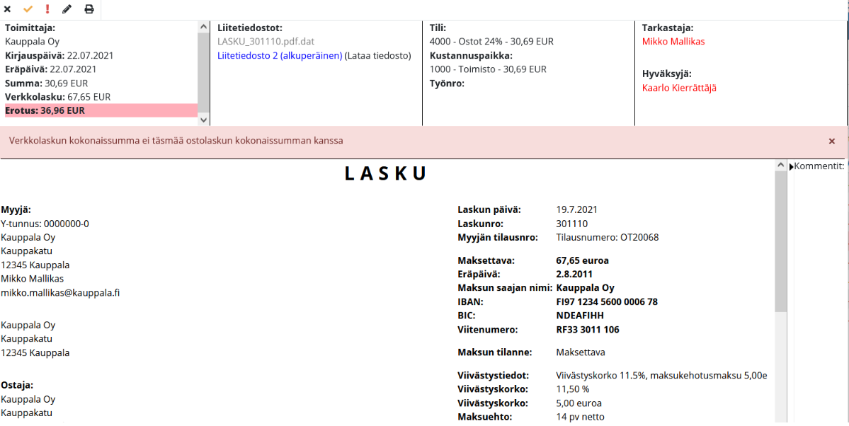 Mikäli verkkolaskuaineistosta luodun ostolaskun rivien summa eroaa verkkolaskutiedoston summasta, pikakierrätysnäkymässä annetaan tästä varoitusilmoitus ja näytetään erotus, mikäli Verkkolaskun summa täsmää ostolaskun summan kanssa -kohta on määritelty kierron asetuksissa näytettäväksi vireilmoitukseksi.