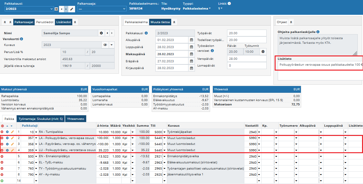 3. Palkkalaskelman Lisätieto-kenttään voidaan antaa lisätietoa polkupyöräedusta: