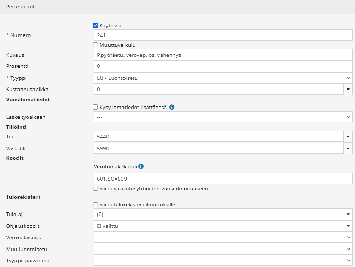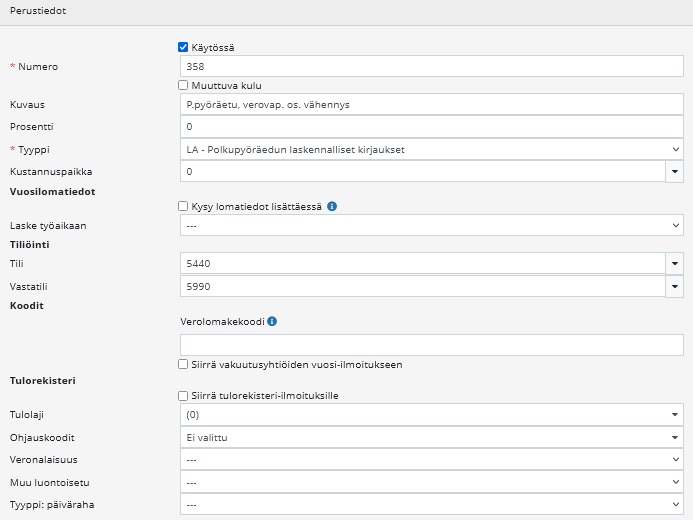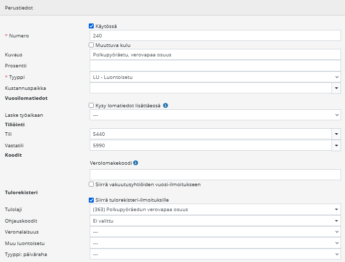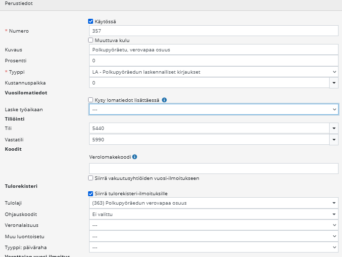 Tällä palkkalajilla kirjataan polkupyöräedun verovapaa osuus ja saadaan tuotua se myös automaattisesti tulorekisteri-ilmoitukselle.
