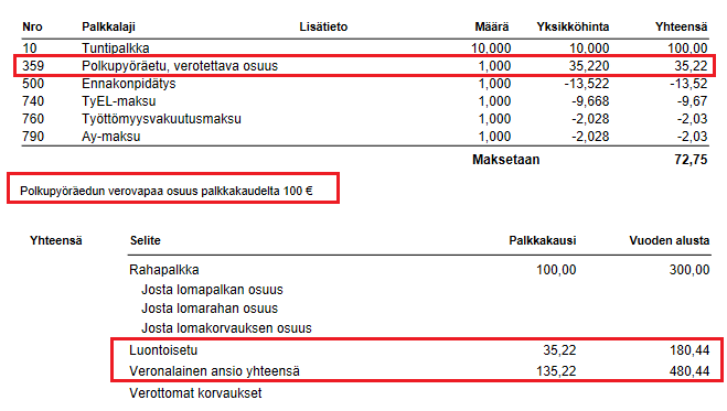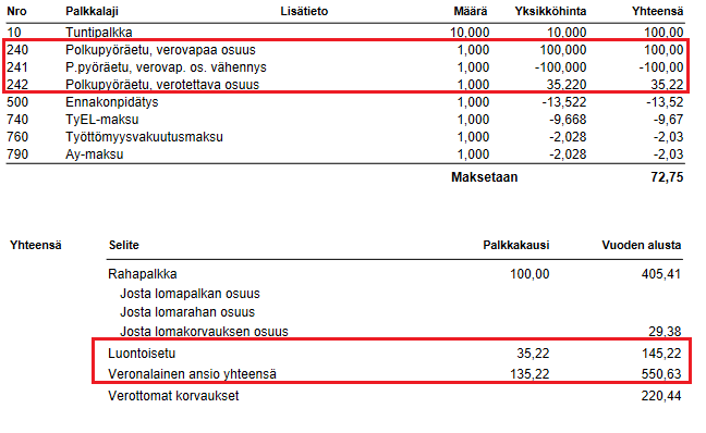 Palkkalaskelmalle kirjataan aina samalla summalla palkkalajilla "Polkupyöräetu, verovapaan osuuden vähennys" kuin mitä kirjataan palkkalajilla "Polkupyöräetu, verovapaa osuus". Alla esimerkki: