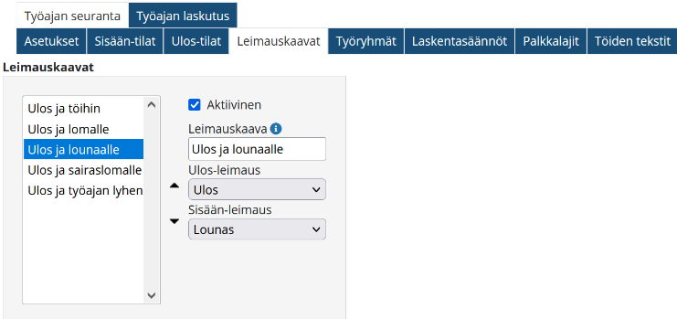 Tehdyt leimauskaavat näkyvät leimauksella Ulos vaihtoehtoina sillä sisään-tilan leimauksella, mihin kyseinen kaava on kytketty.