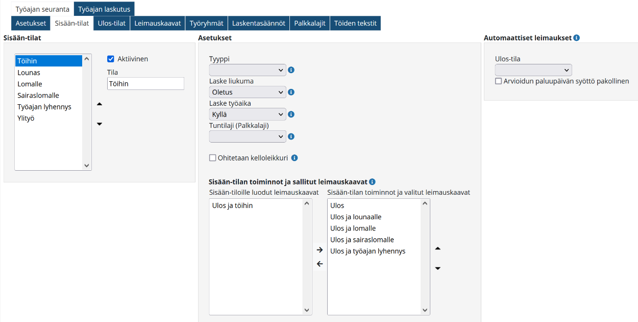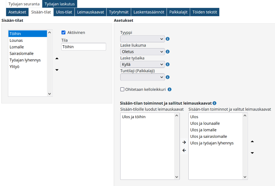 Sisään tilan toiminnot ja sallitut leimauskaavat, Sisään tiloille voidaan kullekin poimia luotuja leimauskaavoja ja muokata niiden järjestystä työajan leimauksella. Kullekin sisään tilalle on valittavana kaikki aktiiviset leimauskaavat. Ulos-tiloja ei voi poistaa sisään-tilojen toiminnoista.