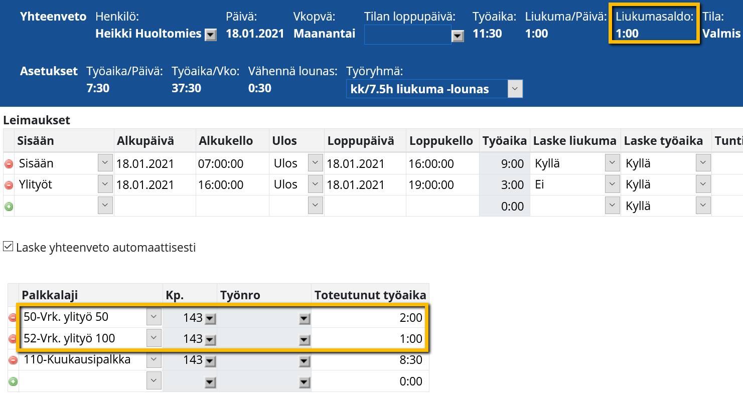 Esim. henkilö kuuluu kk/7,5h liukuma-lounas työryhmään, työryhmällä on liukumat käytössä ja työryhmälle määritetyllä laskentasäännölle on tehty ylityömääritykset > esim. 2h vrk ylityö 50% ja tästä seuraavat tunnit 100% vrk. ylityö.