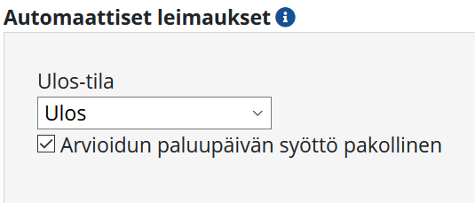 Arvioidun paluupäivän syöttö on asetettava aktiiviseksi, mikäli käytetään automaattista loma/sairaslomaleimausta.