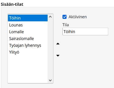 Sisään-tilat määritellään asetuksissa. Nämä tilat näkyvät, kun tehdään sisään leimauksia Kello-sovelluksessa (myös Kello-MobiAPP leimaustiloina).