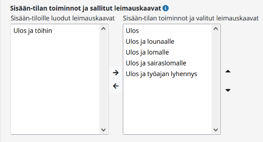 Sisään tilan toiminnot ja sallitut leimauskaava-kohdassa valitaan Sisään tiloille luodut leimauskaavat-kohdasta haluttu leimauskaava ja siirretään se joko kaksoisnapsauttamalla kaavan nimeä tai nuoli -> painikkeella oikealle puolen Sisään tilan toiminnot ja valitut leimauskaavat sarakkeeseen.
