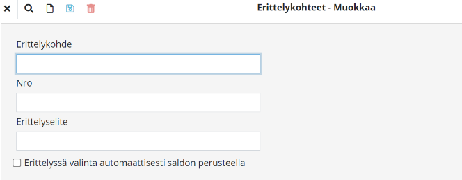Erittelykohde-kenttä on pakollinen. Siihen syötetään erittelykohteen nimi. Erittelykohde, ja sen saldo tuodaan tase-erittelyille näkyviin tässä kentässä olevalla nimellä.