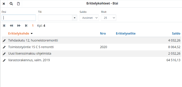 • Ctrl+F painaminen Erittelykohde-kentässä avaa erittelykohteiden Etsi-näkymän
