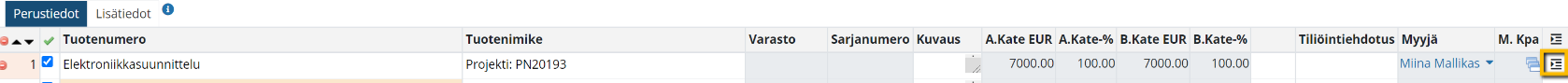 Jos vientiriville on annettu Erittelykohde tai Ryhmä -tieto, mutta Erittelyssä-valinta ei ole rivillä aktiivinen, on kuvake sininen.