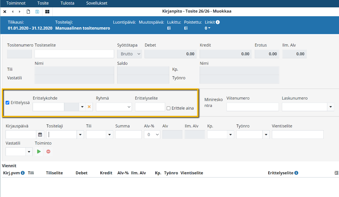 Huom! Vastatilin käyttöön manuaalitositetta kirjatessa on syytä kiinnittää erityistä huomiota. Jos vientiriville on annettu erittelykohde, viedään myös vastakirjaustilin summa samalle erittelykohteelle. Täten on suositeltavaa tehdä erittelykohteelle kohdistetut kirjaukset ilman vastatili-toimintoa, ettei erittelykohteelle vahingossa tule kirjattua myös vastakirjauksen saldoa.
