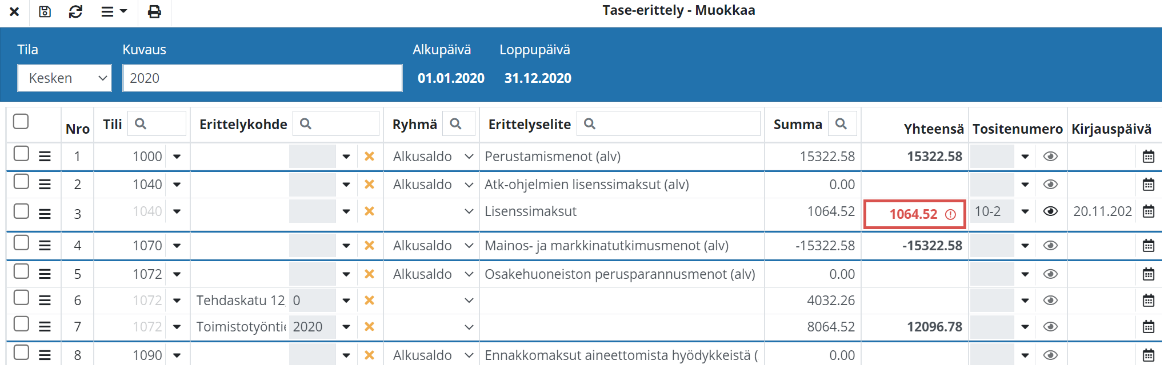 Varmista, että olet laskenut tilikausien alkusaldot ja summataulut muutoksien jälkeen.