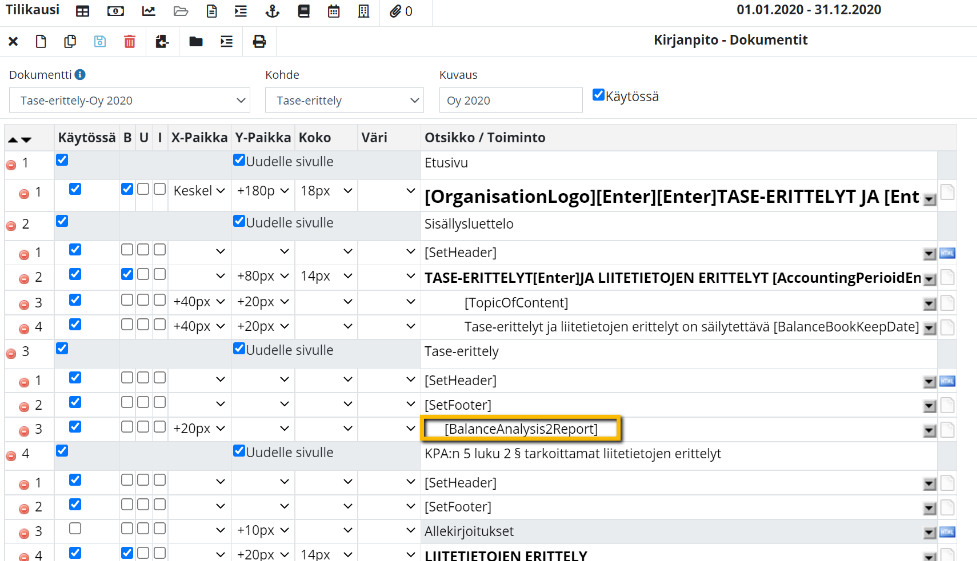 Uuden tase-erittelyn voi asettaa tulostumaan tase-erittely dokumentille menemällä Kirjanpito etsi-näkymästä Dokumentit- alisovellukseen.