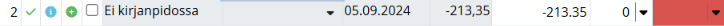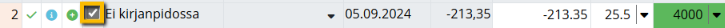 Kun tili on valittu riville tulee automaattisesti vientivalinta (valinta tositenumerokentän vasemmalla puolella), jolloin rivi on valmis vietäväksi kirjanpitoon. Ilman tiliöintiä riviä ei voi viedä kirjanpitoon.