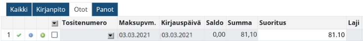 Mikäli Panot-välilehdellä järjestelmä löytää suoritusta vastaavan laskun, tuo se kyseisen laskun numeron ehdolle Tositenumero-kenttään ja tällöin rivin käsittely Kirjanpitovälilehdeltä ei ole mahdollista.