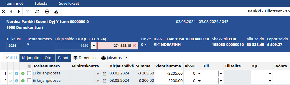 Kun tarvittavat tiedot on riville annettu, tiliotteen valitut rivit voi viedä kirjanpitoon napsauttamalla Vie kirjanpitoon -painiketta tai valitsemalla Toiminnot-valikko > Vie kirjanpitoon.