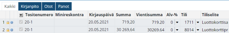 Mikäli ottoja ja panoja ei ole tunnistettu reskontraan, ne näytetään myös Kirjanpito-välilehdellä.