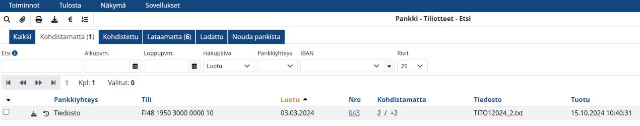 Aineistot, joita on lisätty tiedostoina tai noudettu pankista, ovat Kohdistamatta-välilehdellä, kunnes aineistolla kuitataan laskuja maksetuiksi.