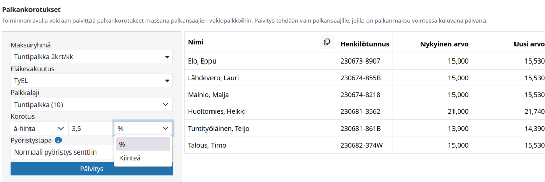 Kun korotus annetaan kenttään, näytetään palkansaajien kohdalla Uusi arvo-kenttään korotuksen mukainen arvo (alla olevassa esimerkissä 3,5% korotus)