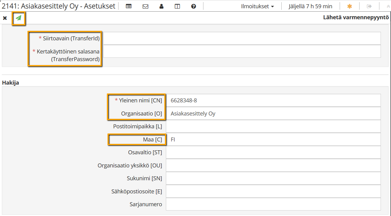 Asiakkaan tunniste- ja Asiakkaan nimi -kentissä tulee olla samat tiedot kuin siellä organisaatiossa, mistä varmenne on ladattu.