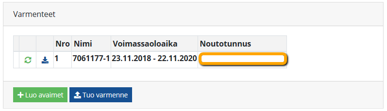 Varmennepyynnön onnistuessa tulee Tulorekisteristä vastaus ja Varmenteet -kohtaan tulee näkyville varmenteen voimassaoloaika ja Noutotunnus -kenttään tuodaan varmenteen Noutotunnus (kuvassa peitetty).
