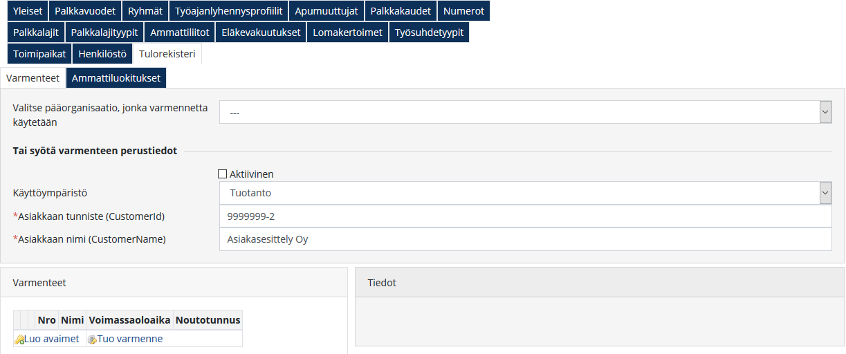 Asetukset > Sovellukset > Palkka > Tulorekisteri - Varmenteet-välilehti