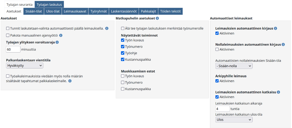 Asetetaan Leimauksien automaattinen kirjaus -valinta aktiiviseksi.