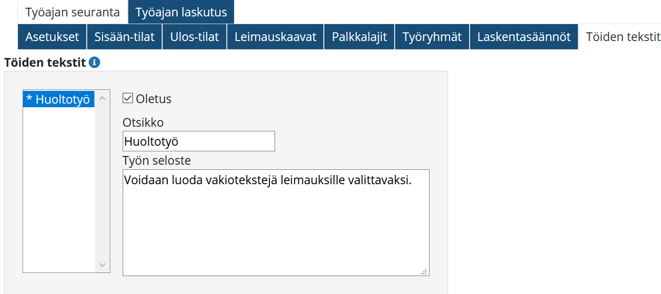 Töille voidaan määritellä valmiita tekstejä, jotka voidaan poimia leimaukselle. Oletukseksi määritelty tulee automaattisesti uudelle leimaukselle.