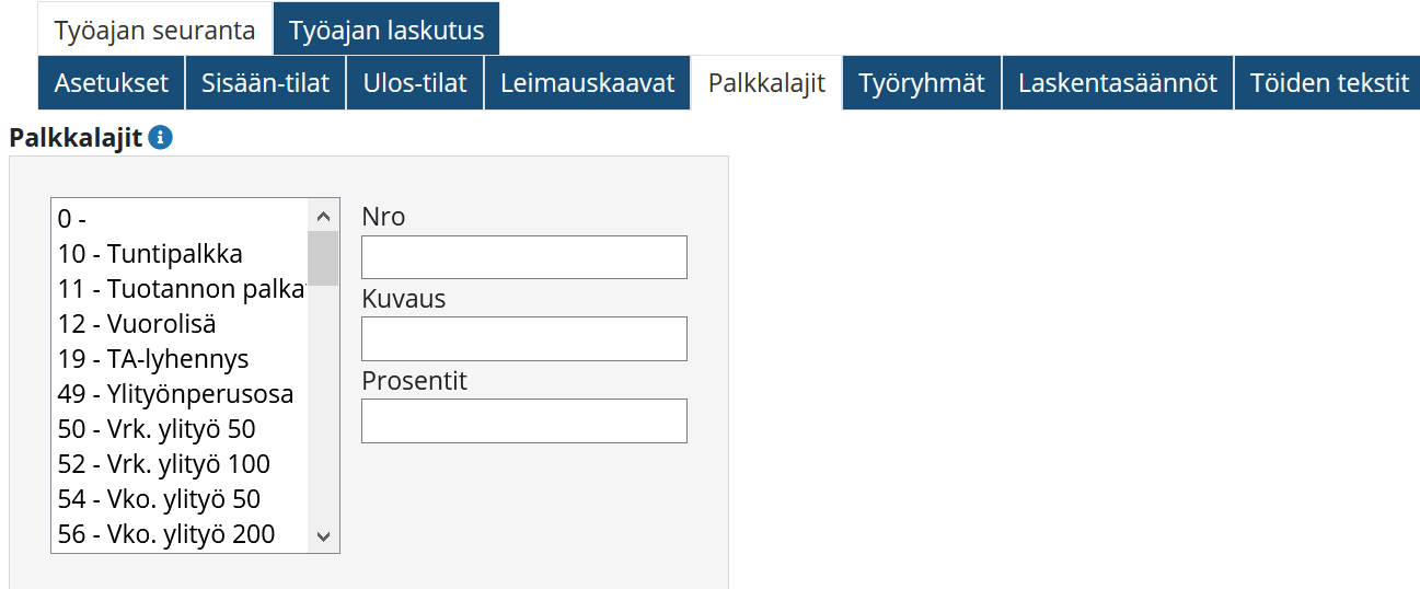 Mikäli Palkka-Baron ei ole käytössä, voidaan kellon asetuksissa luoda tarvittavat palkkalajit. Perustetut palkkalajit tulevat poimittaviksi Sisään-tilojen Tuntilaji valikkoon sekä Laskentasääntöihin.