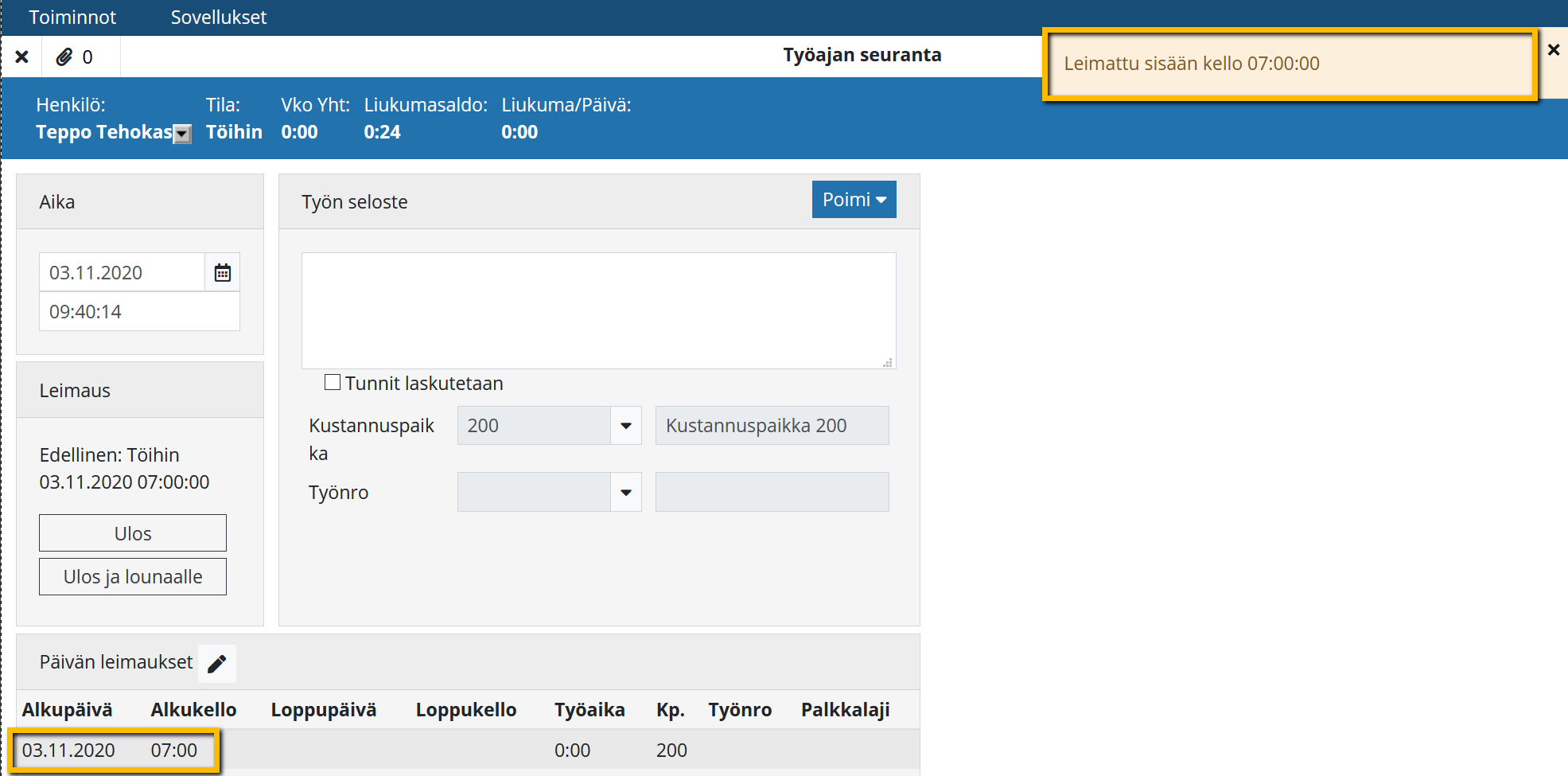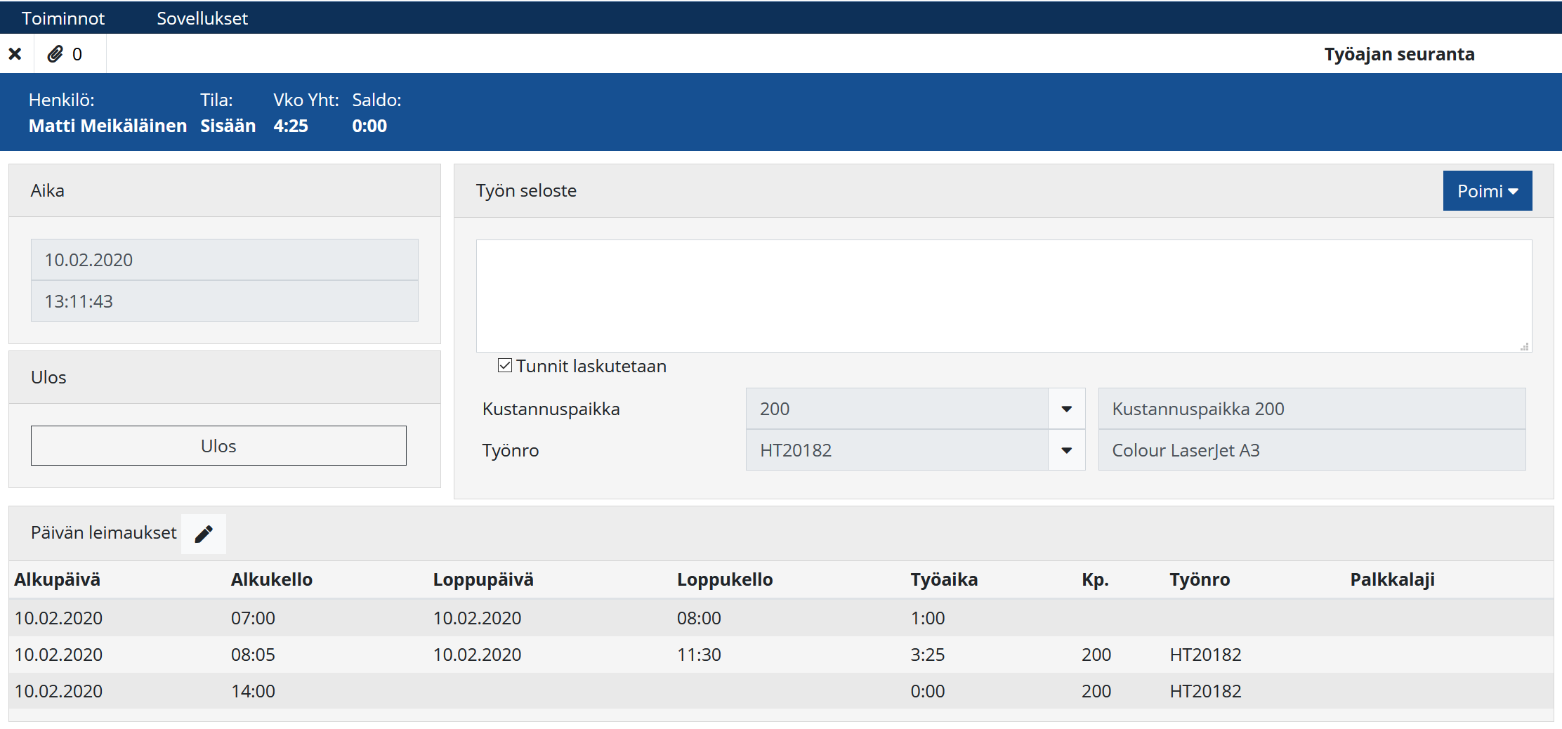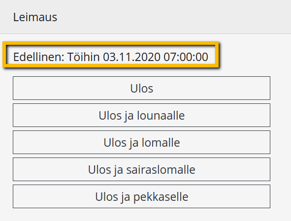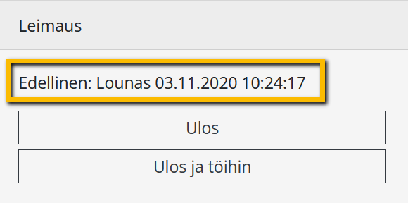 Esimerkki, kun viimeisimmäksi on leimattu Ulos ja lounaalle ja palataan takaisin töihin lounaalta. Edellinen kohdassa näytetään mihin aikaan lounaalle on leimattu.