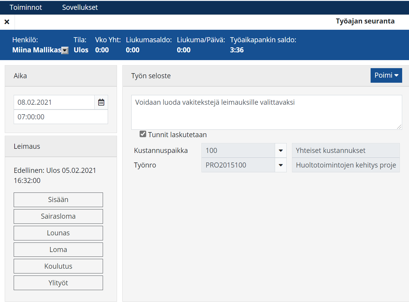 Vastaavasti lounas leimaukselle voidaan tehdä painike esim. Ulos ja töihin jolloin leimataan tätä napsauttamalla lounas-leimaus ulos ja tehdään automaattisesti uusi sisäänleimaus.