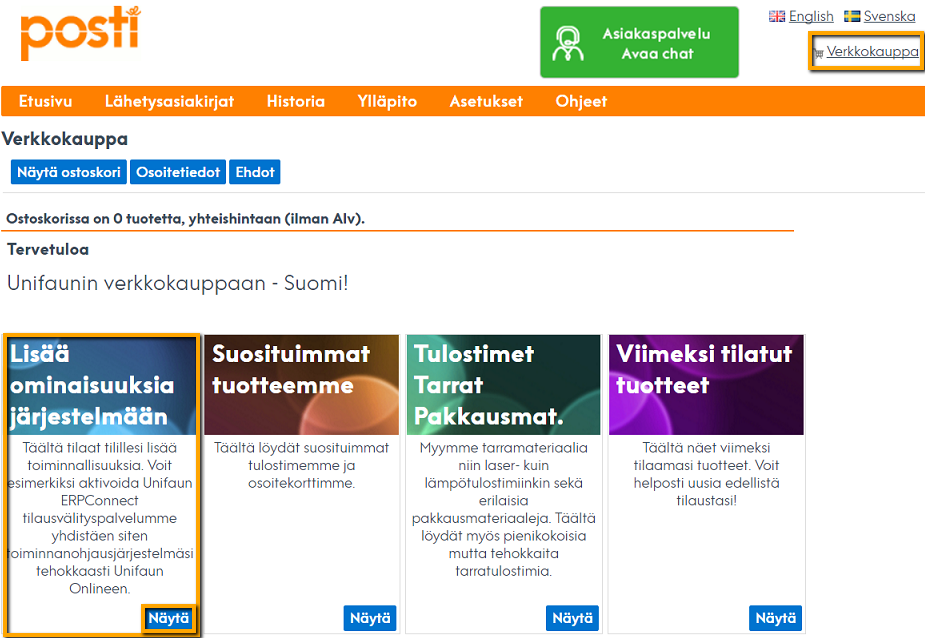 Mikäli käytetään rahdinkuljettajana ainoastaan Postia, voi Unifaun-rajapinnan avata Posti SmartShip -palvelun integraatiorajapintaan (paketti- ja rahtikuljetukset).