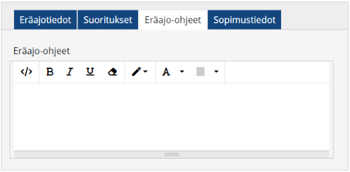 Eräajo-ohjeet -kenttään tuodaan teksti joka on tallennettu Eräajo-ohjeet välilehdelle. Kentän tiedot eivät siirry muodostettaville laskuille.