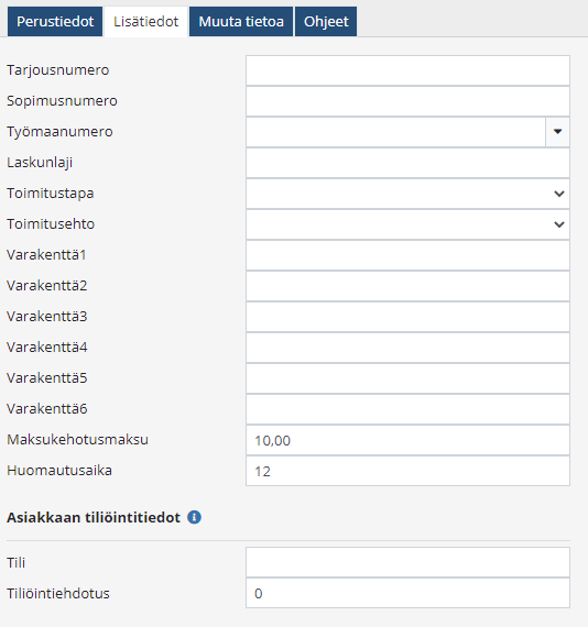 Laskun Lisätiedot-välilehdellä löytyvät mm. Maksukehotusmaksu- ja Huomautusaika-kentät.