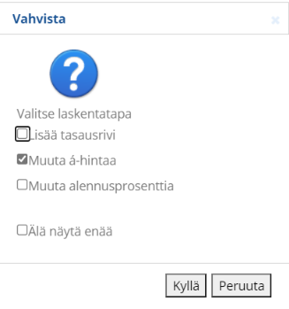 Ennen alv-% vaihtamista käyttäjälle huomautetaan, että rivien alv-prosentin vaihtaminen ei päivitä tiliöintejä, ja neuvotaan tarkistamaan ne jälkeenpäin. Käyttäjän pitää vielä erikseen hyväksyä muutos dialogissa. Vasta tämän jälkeen muutos varsinaisesti tehdään riveille.