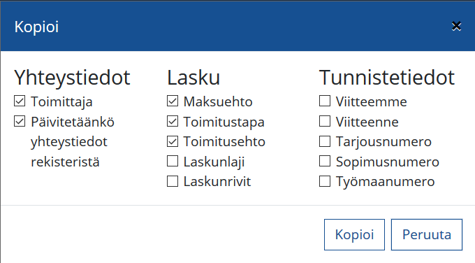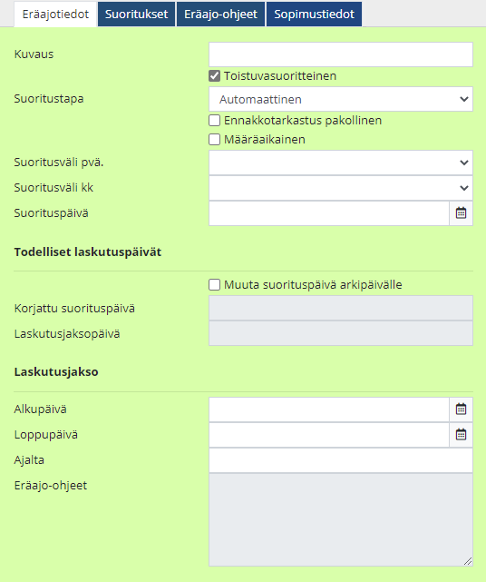 Mikäli otetaan kopio eräajolaskusta, tyhjennetään suorituspäivä, korjattu suorituspäivä ja laskutusjaksopäivä. Lisäksi tyhjennetään suoritusvälivalikot ja haetaan asetuksista oletusasetus Muuta suorituspäivä arkipäivälle -valintaan.