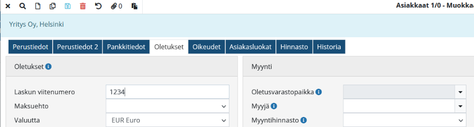 Saman viitenumeron käyttö on mahdollista asiakkaittain. Viitenumero otetaan asiakasrekisterin Oletukset-välilehden Laskun viitenumero -kentästä.