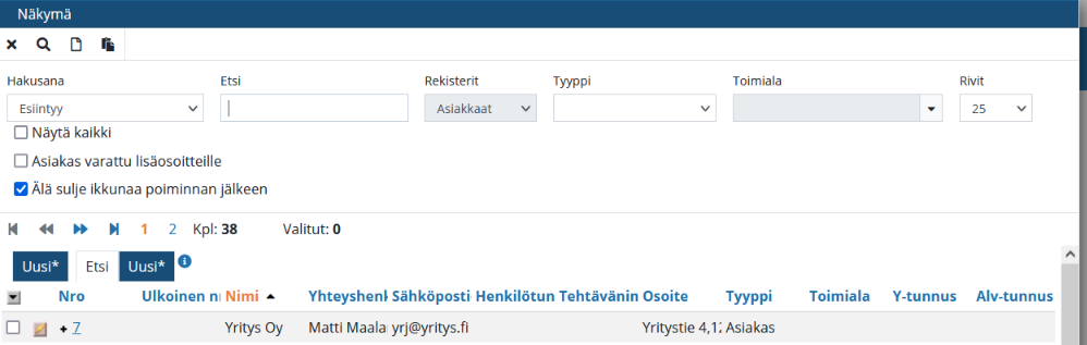 Kun asiakasrekisteri avautuu, valitaan asiakas napsauttamalla kerran valittua riviä ja napsautetaan Muokkaa-painiketta.