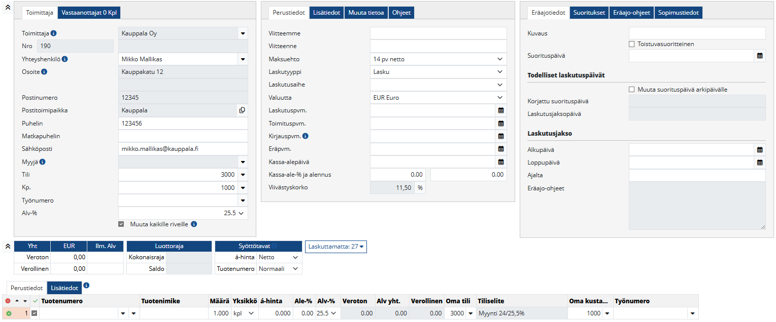 Täytetään laskulle tarvittavat tiedot ja luodaan laskurivit laskulle.