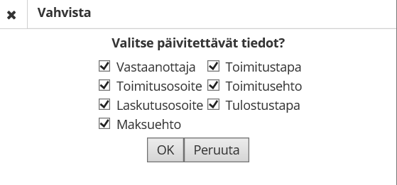 Asiakasrekisteristä poimitun vastaanottajan tietoja voi muuttaa joko kirjoittamalla tiedot suoraan kenttiin tai poimimalla uuden tiedot asiakasrekisteristä napsauttamalla poimintapainiketta.