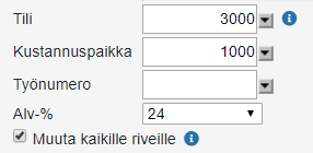 Valitsemalla Muuta kaikille riveille -valinnan aktiiviseksi, muuttuvat valinnan yläpuolella olevat tiliöinnit, kustannuspaikat, työnumerot ja alv-% kaikille laskun riveille.
